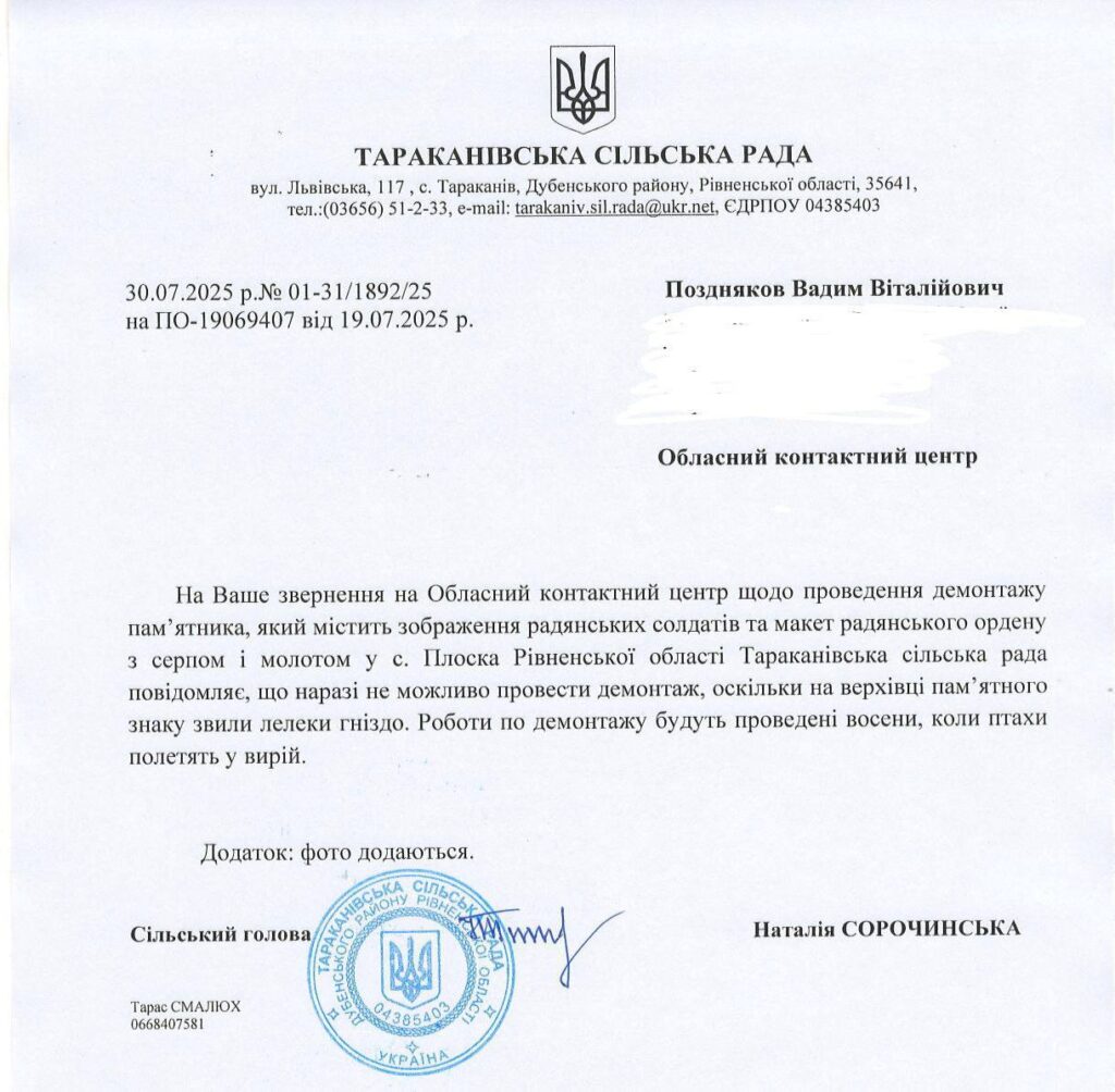 Это официальное решение Таракановского сельского совета — в ответ на обращение активистов «Деколонизация. Украина».